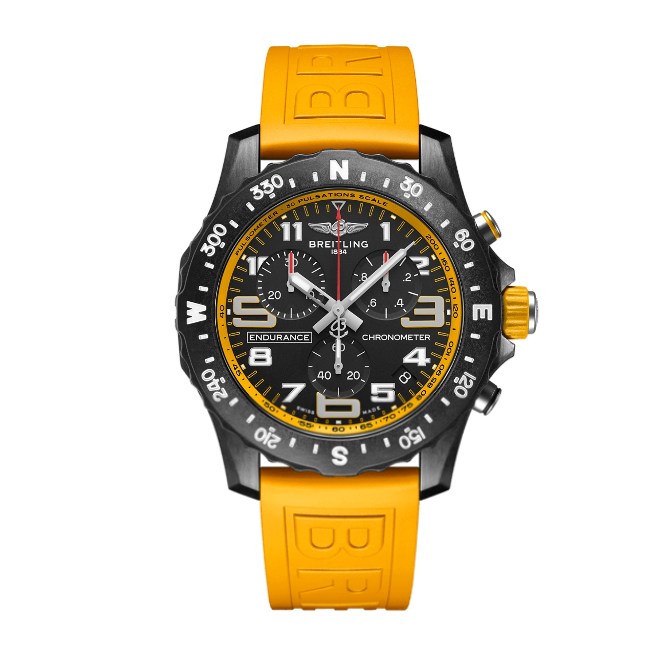 Designed to be both a lightweight watch for athletes and a casual, everyday sports chronograph, the Endurance Pro perfectly blends high precision & innovative technology with a vibrant & colorful design. It is the ultimate athleisure watch. Designed for men and women whose active lives blend a professional mindset with a sporty lifestyle, the Endurance Pro is equal to the challenges of a rigorous workout but fashionable enough for everyday wear. The Endurance Pro features an ultra-light Breitlight® case, a robust material 3.3 times lighter than titanium and 5.8 times lighter than stainless steel. Non-magnetic, thermally stable and hypoallergenic, Breitlight® is highly resistant to scratches, traction and corrosion. It also has a touch that is warmer than metal and a slightly textured effect accentuating the originality of the design. Exclusive to Breitling, it is 100% Swiss-made. Offered with a set of colorful dial and rubber straps fitting a Breitlight® double tang-type buckle, the Endurance Pro can also be paired with one of Breitling’s colorful Outerknown ECONYL® yarn single-piece strap. Powering the Endurance Pro is Breitling’s Caliber 82, a COSC-certified SuperQuartz™ chronograph delivering exceptional precision.