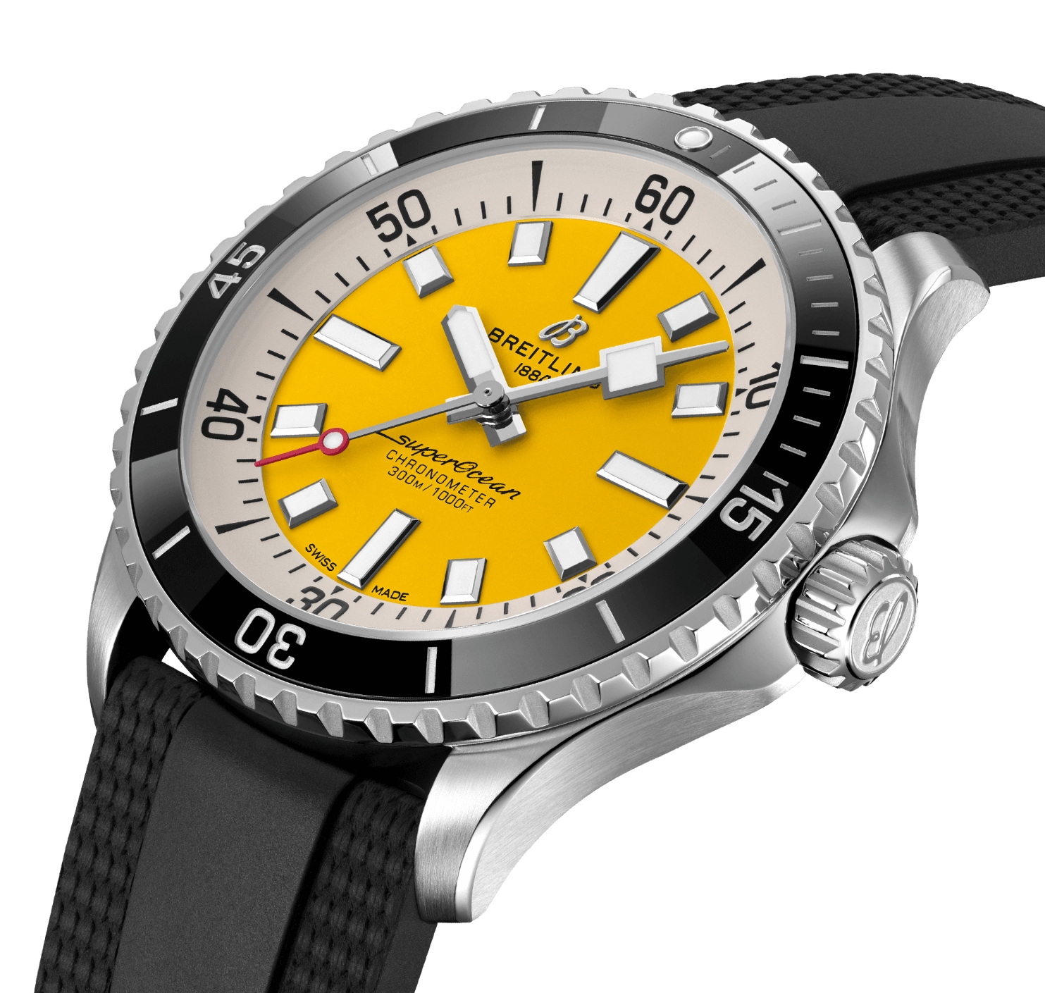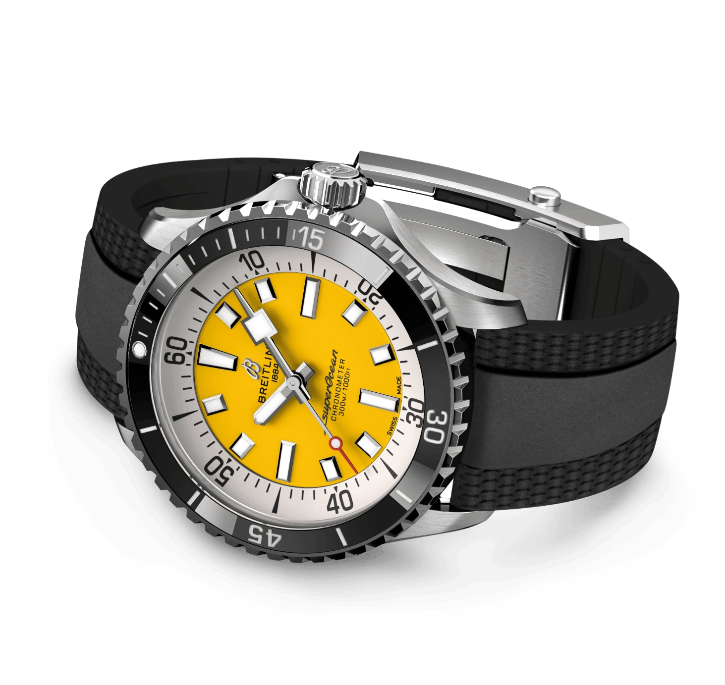 Performance and style for all your water sports. A special online exclusive yellow dial model is now available. In the 1960s, the new sport of scuba diving became all the rage. For divers, every second counts, so Breitling set out to provide them with the clearest and most readable diving watch, and deleted all functions that did not support underwater life-saving needs. The streamlined watch is called “Slow Motion”. The watch retains clean lines, thick luminous hour markers, square hands and a contrasting bezel, all designed to maximize legibility. The practicality is truly outstanding. But what really makes people fall in love with it is its appearance. The new Superocean watch retains the famous design elements of the Slow Motion watch while adding modern features, such as a ceramic inlaid bezel and a brightly colored dial. The wide hands and hour markers are coated with Super-LumiNova® for easy reading underwater. The watch is water-resistant to 300 meters (1,000 feet) and is shock-proof, sand-proof and sea-water proof. The bronze version uses a special alloy that is extremely resistant to corrosion, but will still develop a subtle tarnish over time, making the watch even more unique. Two strap options (rubber and metal) with folding clasp allow for fine adjustments of up to 15 mm, making it easy to wear over a jellyfish suit or wetsuit. The scratch-resistant ceramic inlaid bezel will never wear or fade. For security reasons, most bezel sizes are unidirectional; the 46mm bezel is bidirectional and features a patented lock. Even better, it's not strictly a dive watch anymore - you can wear it surfing, swimming, heading to a beach bar and then to dinner. The Superocean watch is the perfect balance between nostalgic feelings for the historical heritage of the watch and a new look.