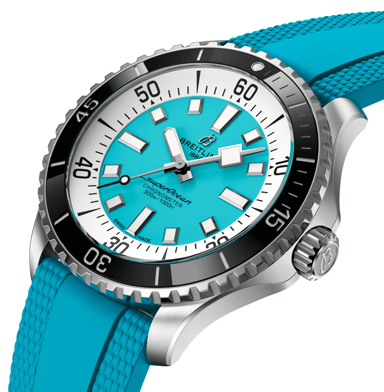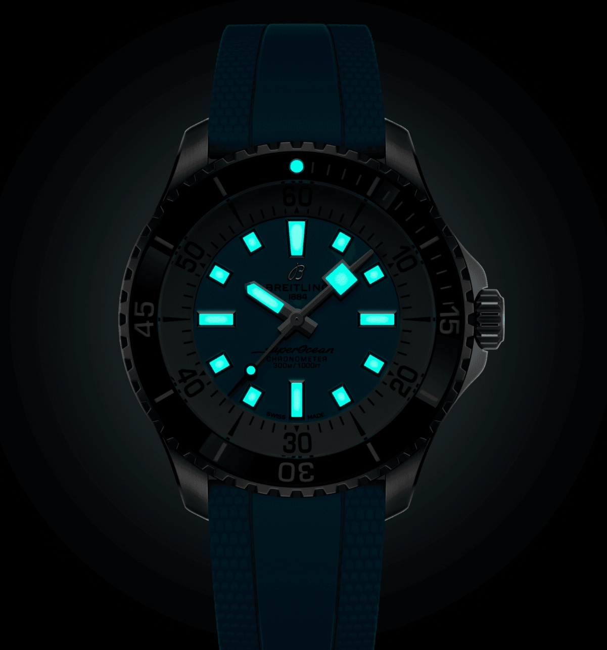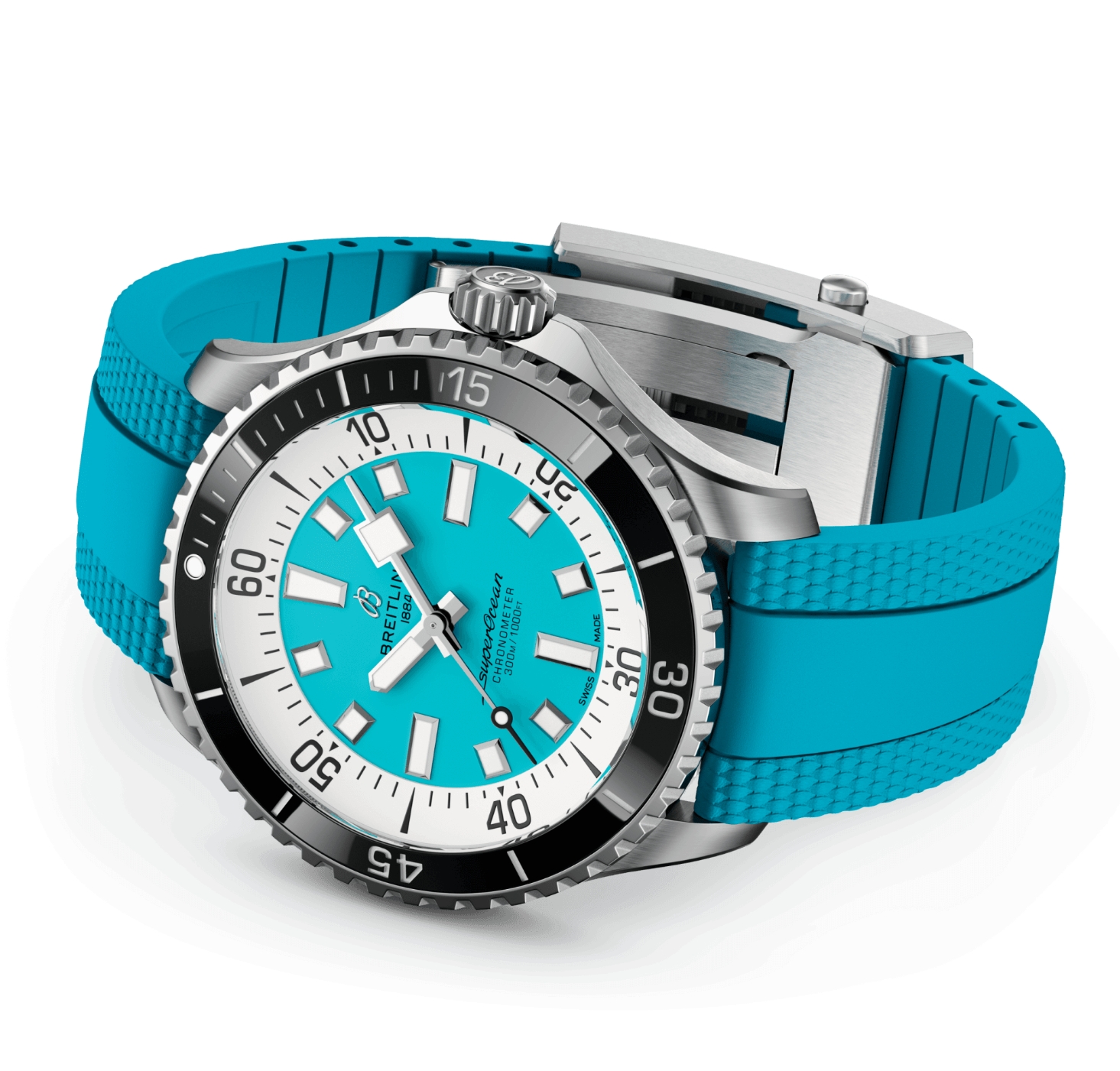 Performance and style for all your water sports. In the 1960s, the new sport of scuba diving became all the rage. For divers, every second counts, so Breitling set out to provide them with the clearest and most readable diving watch, and deleted all functions that did not support underwater life-saving needs. The streamlined watch is called “Slow Motion”. The watch retains clean lines, thick luminous hour markers, square hands and a contrasting bezel, all designed to maximize legibility. The practicality is truly outstanding. But what really makes people fall in love with it is its appearance. The new Superocean watch retains the famous design elements of the Slow Motion watch while adding modern features, such as a ceramic inlaid bezel and a brightly colored dial. The wide hands and hour markers are coated with Super-LumiNova® for easy reading underwater. The watch is water-resistant to 300 meters (1,000 feet) and is shock-proof, sand-proof and sea-water proof. The bronze version uses a special alloy that is extremely resistant to corrosion, but will still develop a subtle tarnish over time, making the watch even more unique. Two strap options (rubber and metal) with folding clasp allow for fine adjustments of up to 15 mm, making it easy to wear over a jellyfish suit or wetsuit. The scratch-resistant ceramic inlaid bezel will never wear or fade. For security reasons, most bezel sizes are unidirectional; the 46mm bezel is bidirectional and features a patented lock. Even better, it's not strictly a dive watch anymore - you can wear it surfing, swimming, heading to a beach bar and then to dinner. The Superocean watch is the perfect balance between nostalgic feelings for the historical heritage of the watch and a new look.