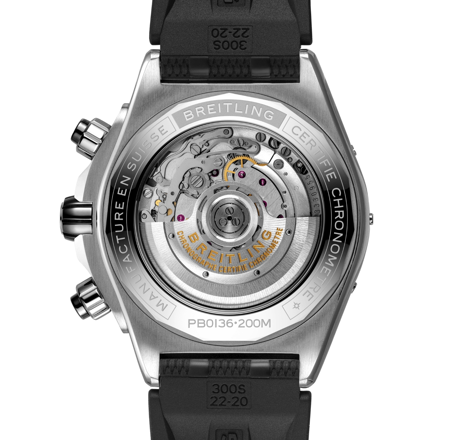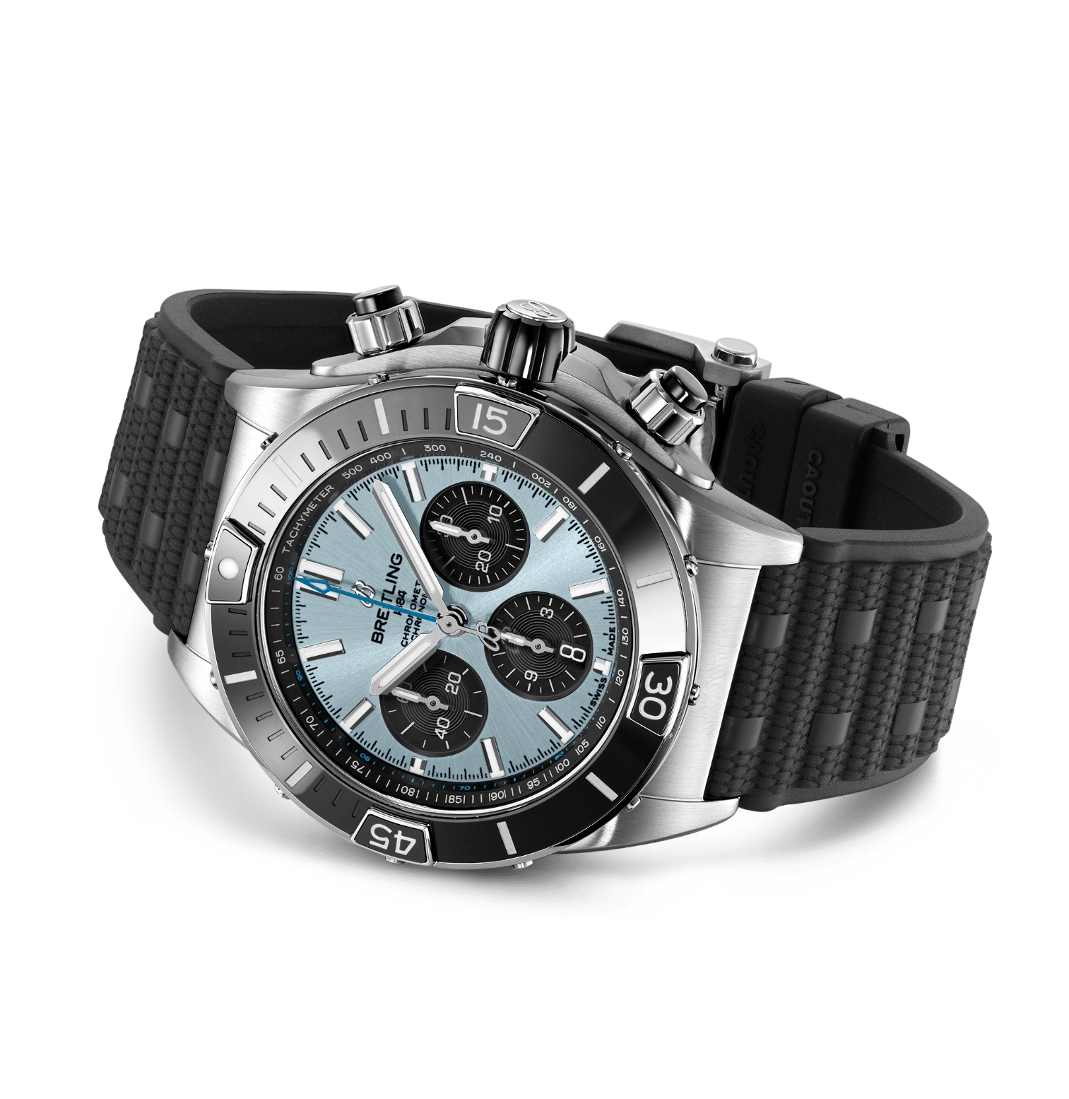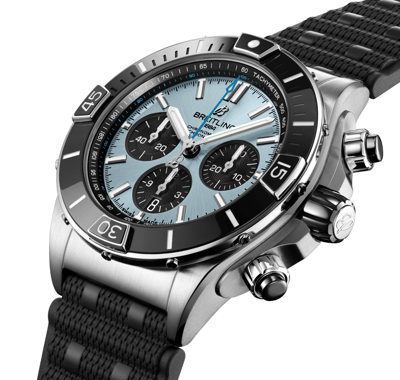 Breitling’s supercharged watch for your every pursuit. Inspired by the original 1980s timepiece that Breitling created for the hotshot Frecce Tricolori aerobatic squadron, the Super Chronomat is the boldest in the Chronomat watch family. It comes in several color and metal variations (stainless steel, 18k red gold and platinum) and features ceramic inserts on the bezel, chronograph pushers and crown. Select from either the iconic metal Rouleaux bracelet or a rubber Rouleaux-inspired strap, matched with a folding clasp. The Super Chronomat B01 44 is powered by the Breitling Manufacture Calibre 01, a COSC-certified chronometer.