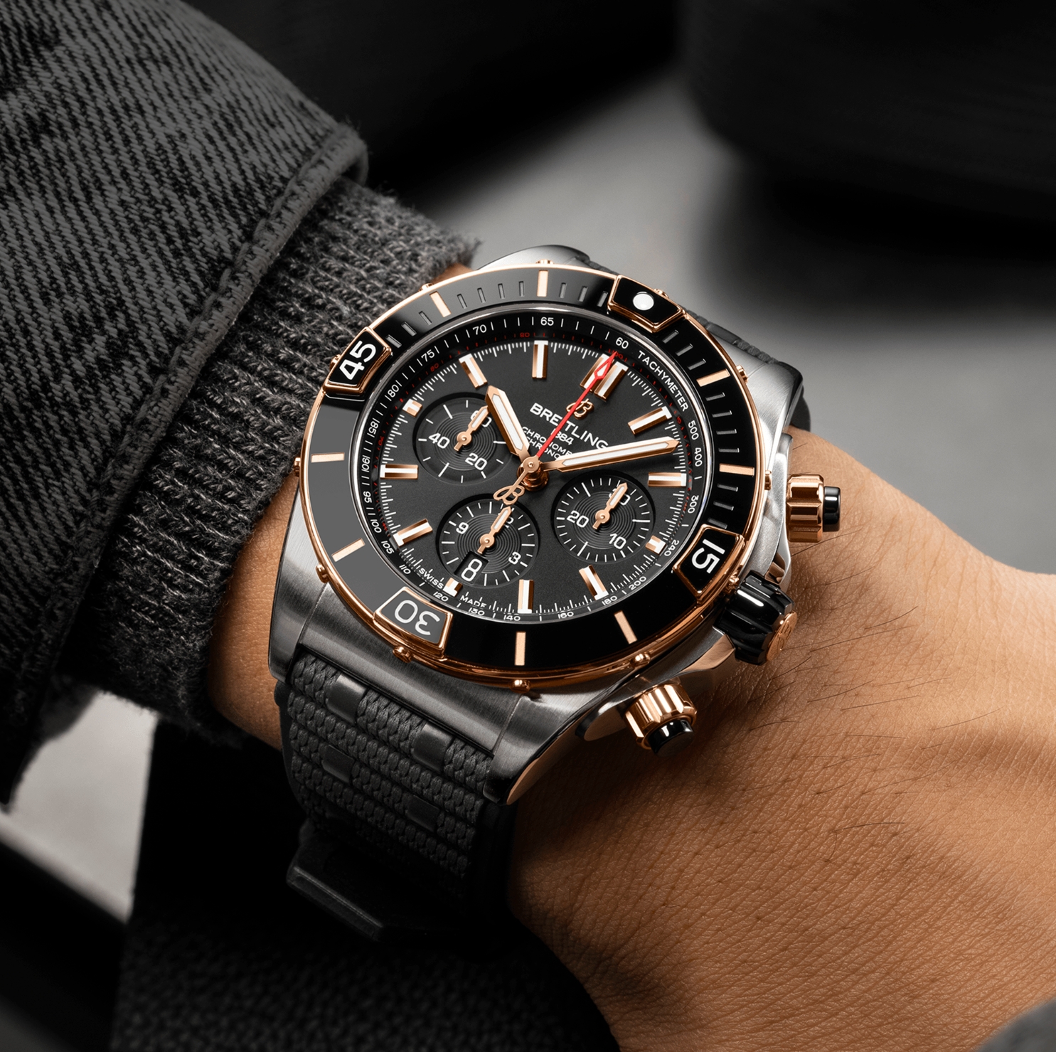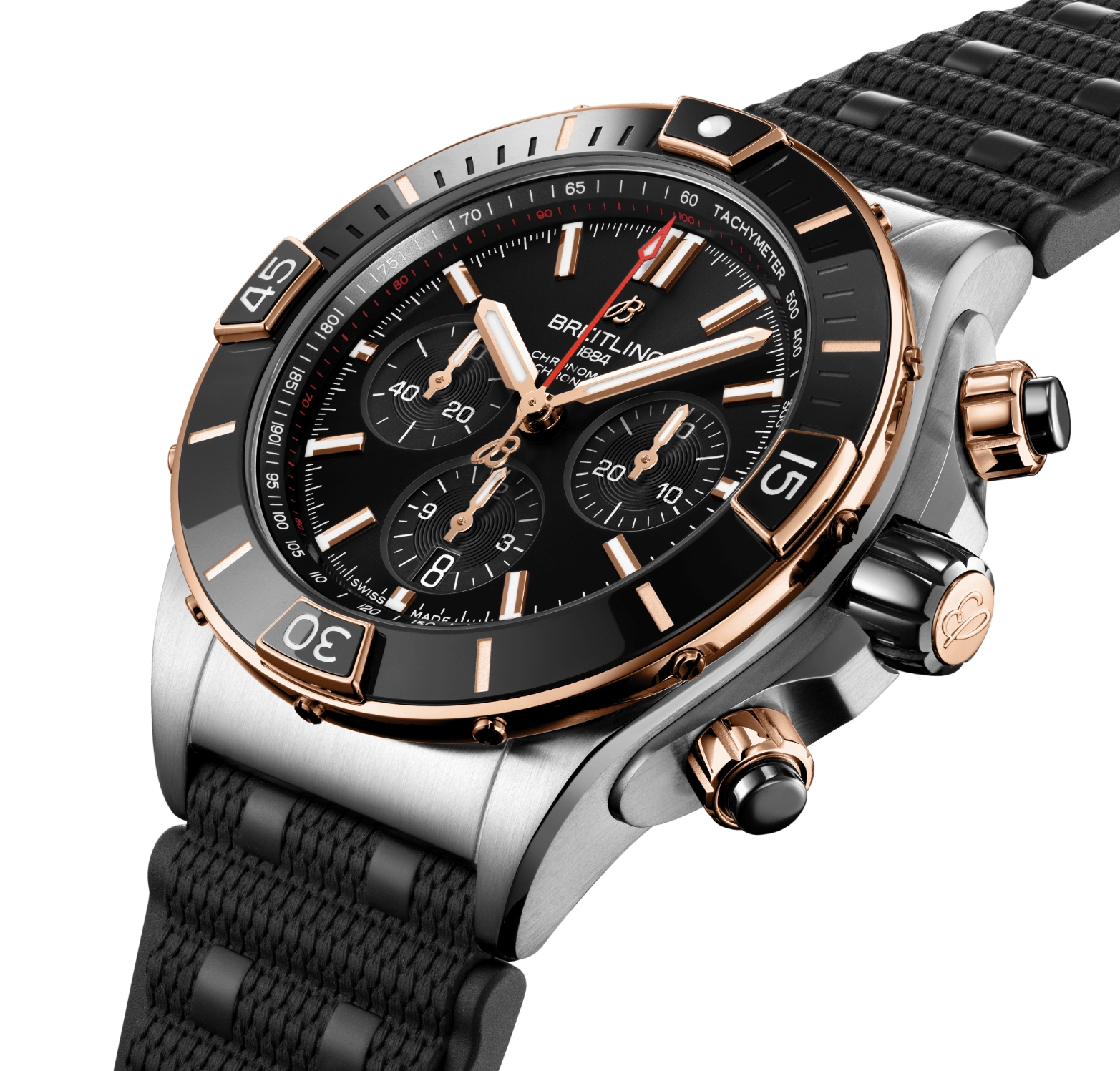 Breitling’s supercharged watch for your every pursuit. The Super Chronomat is inspired by the original 1980s Chronomat that Breitling created for the hotshots of aerobatic squadrons. The boldest of all Chronomat watches, the Super Chronomat features several ceramic inserts – on the bezel, on the chronograph pushers and on the crown – as well as a Rouleaux-inspired rubber strap. Still, this all-purpose sports watch won’t get in the way of your sense of style. The Super Chronomat comes in several colour and metal variations, from stainless steel to 18 k red gold. It either features the iconic Rouleaux bracelet or a rubber Rouleaux-inspired strap, matched with a folding clasp. The Super Chronomat B01 44 is powered by the Breitling Manufacture Calibre 01, a COSC-certified chronometer.