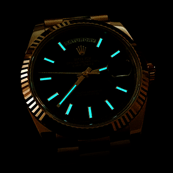 Rolex Day-Date Swiss Replica watches are equipped with the new SuperLuminova™ Blue glow luminescent pigment that after sufficient activation by sunlight or artificial light will glow in the dark up to nine hours with uniform luminosity throughout.