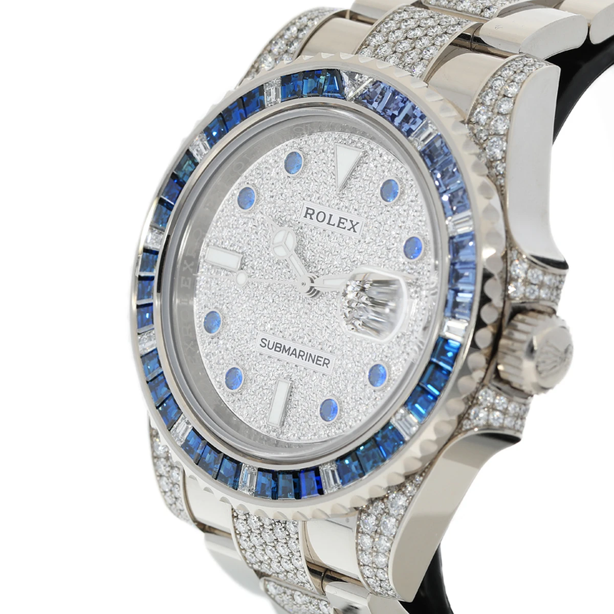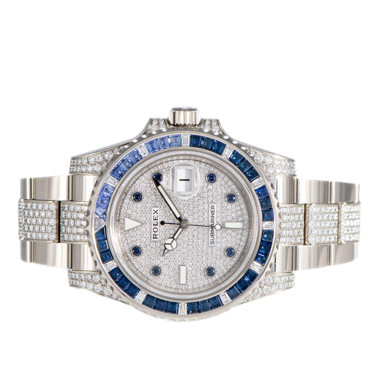 Introducing the epitome of timeless elegance, the Rolex Submariner 116659SABR. Crafted by the prestigious brand Rolex, this exquisite timepiece is a true marvel. With a case size of 0.4 mm, it effortlessly combines sophistication with durability. The automatic movement ensures precision and reliability, while the date display adds practicality to its charm. Encased in 18 K white gold set with diamonds, this watch exudes opulence and luxury. The closed caseback and sapphire crystal glass further enhance its durability and scratch resistance. The Rolex Submariner has a rich history, first released in 1953 as the ultimate diving watch. Over the years, it has become an iconic symbol of style and adventure. From formal occasions to casual outings, this watch is versatile and can be worn with confidence. Elevate your wrist game and make a statement with the Rolex Submariner 116659SABR, a true masterpiece that stands the test of time.
