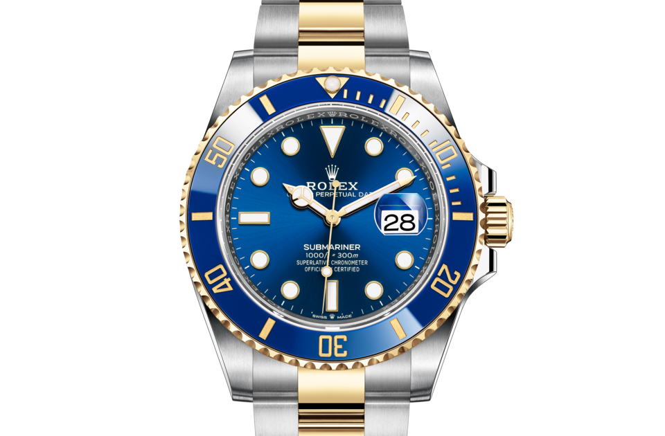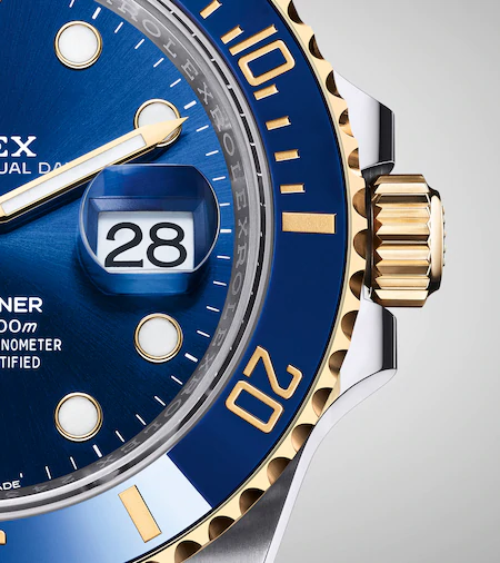 Oyster Perpetual Submariner Calendar watch in gold and Oystersteel models, with a royal blue dial and extra-large luminous hour markers.
